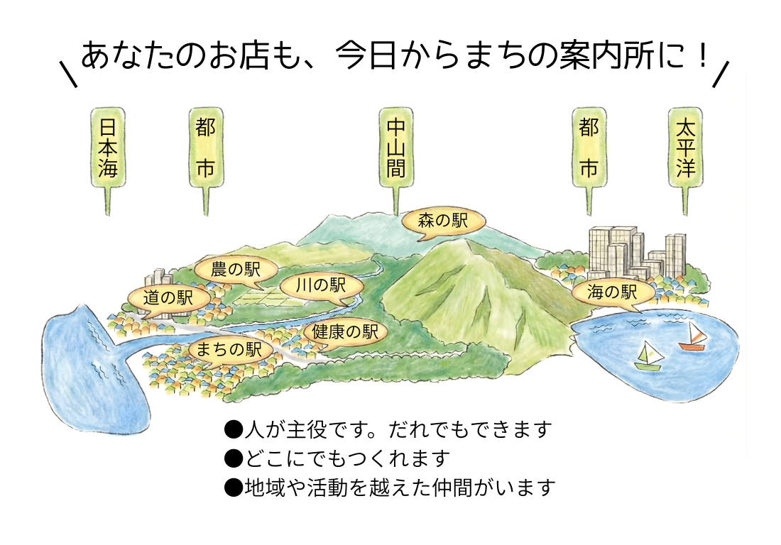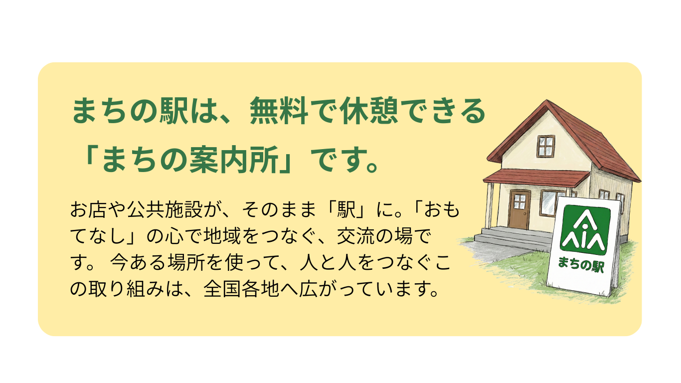 | 休憩…誰でもトイレが利用でき、無料で休憩できる。 案内…「まちの案内人」が、地域の情報について丁寧に教える。 交流…地域の人と来訪者の、出会いと交流のサポートをする。 連携…まちの駅間でネットワーク化し、もてなしの地域づくりをめざす。 |
