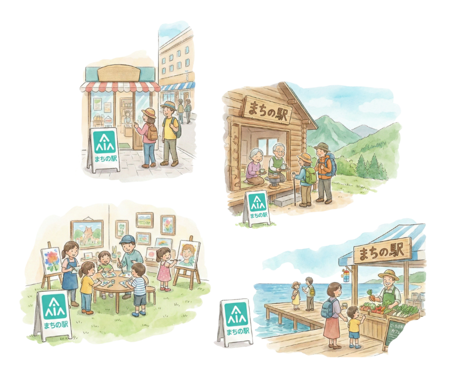 場所は自由: まちの中でも山の中でも、海のそばでも…どこにでも設置できます。 既存の施設やお店が「まちの駅」になれます。