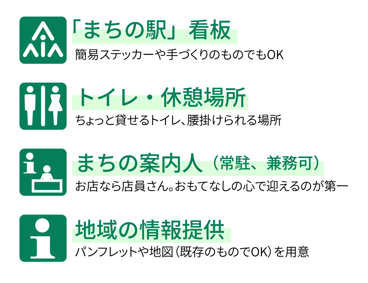 まちの駅になるためには、以下のアイテムが必須になります。